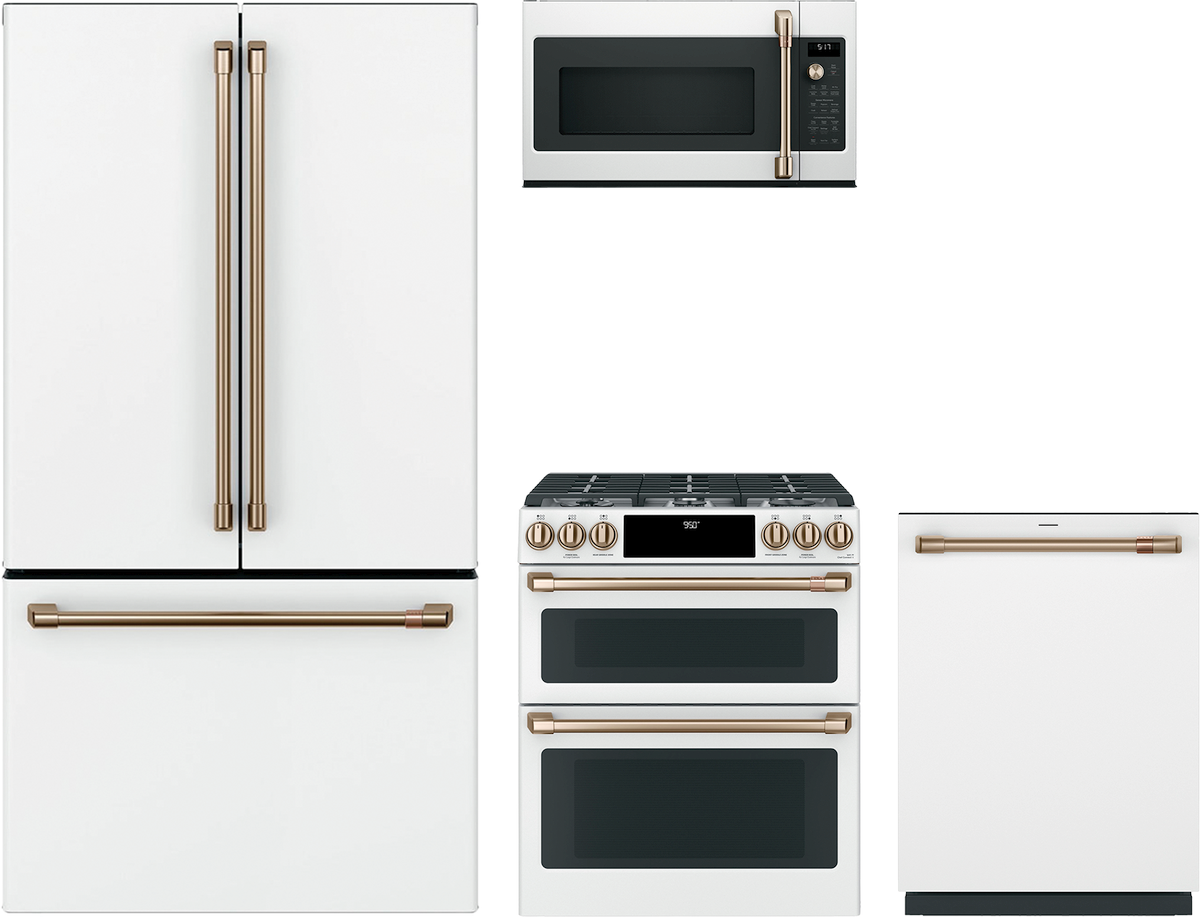 Café™ 4 Piece Matte White Kitchen Package with a French door refrigerator, slide-in dual fuel range, built-in dishwasher, and over the range microwave.Read More