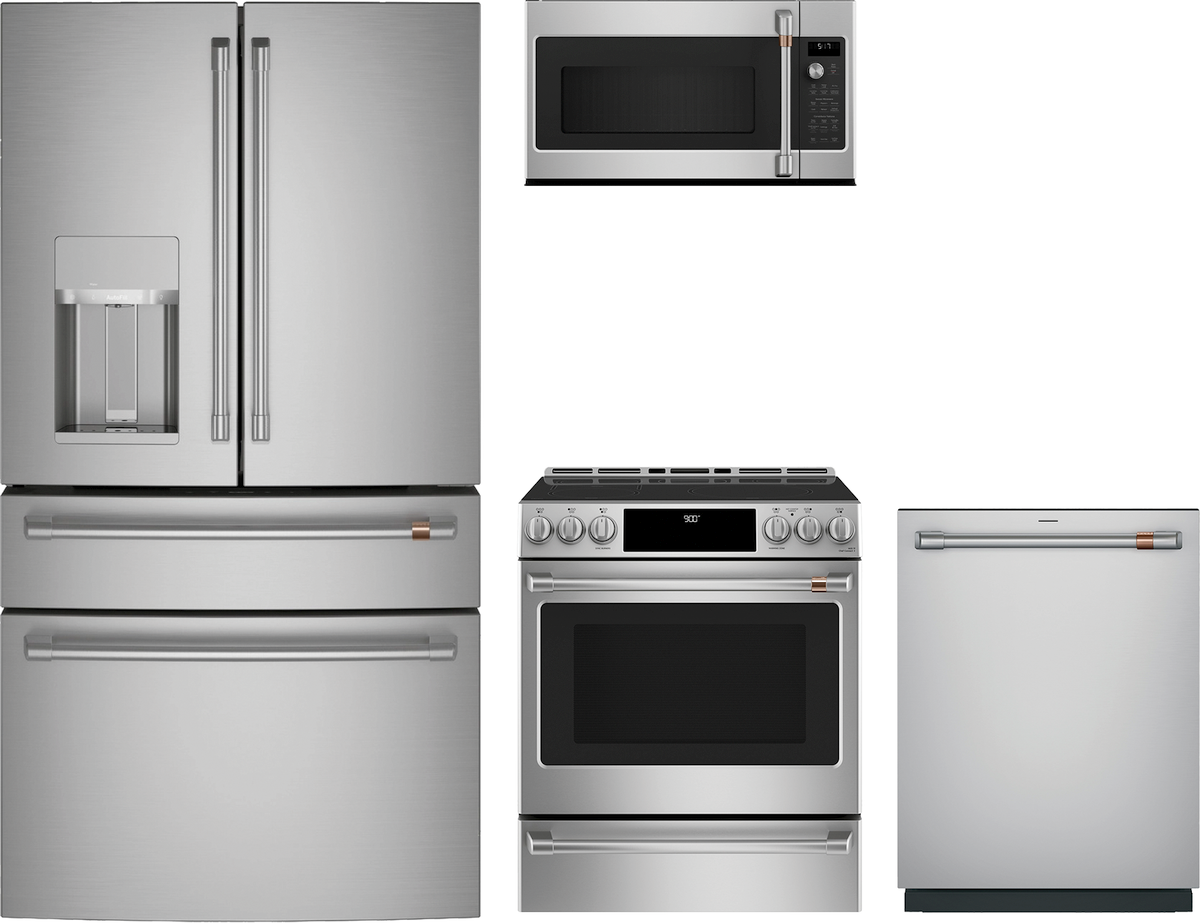 Café™ 4 Piece Stainless Steel Kitchen Package with a French door refrigerator, slide-in induction range, built-in dishwasher, and over the range microwave.Read More