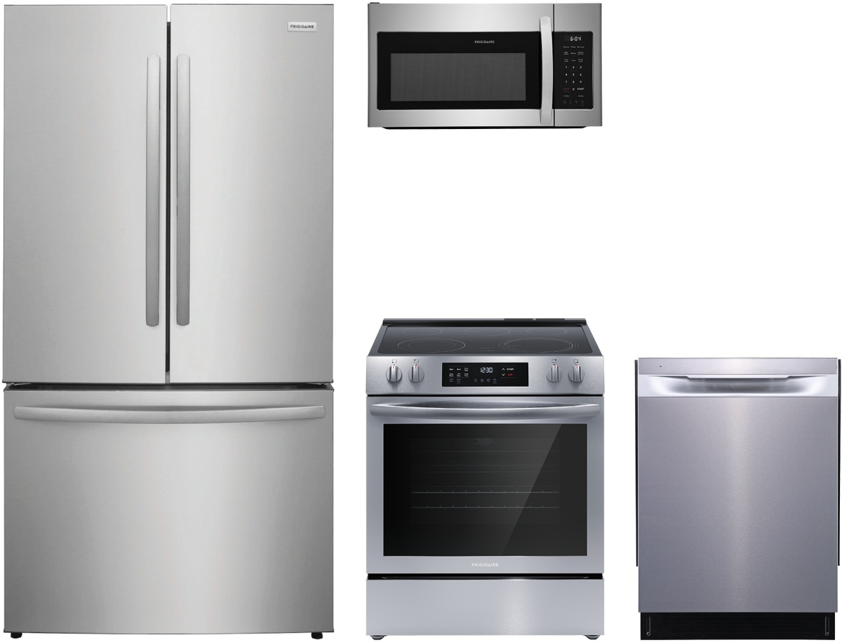 Frigidaire® 4 Piece Stainless Steel Kitchen Package with French door refrigerator, top control built in dishwasher, freestanding electric range, and over the range microwave.Read More
