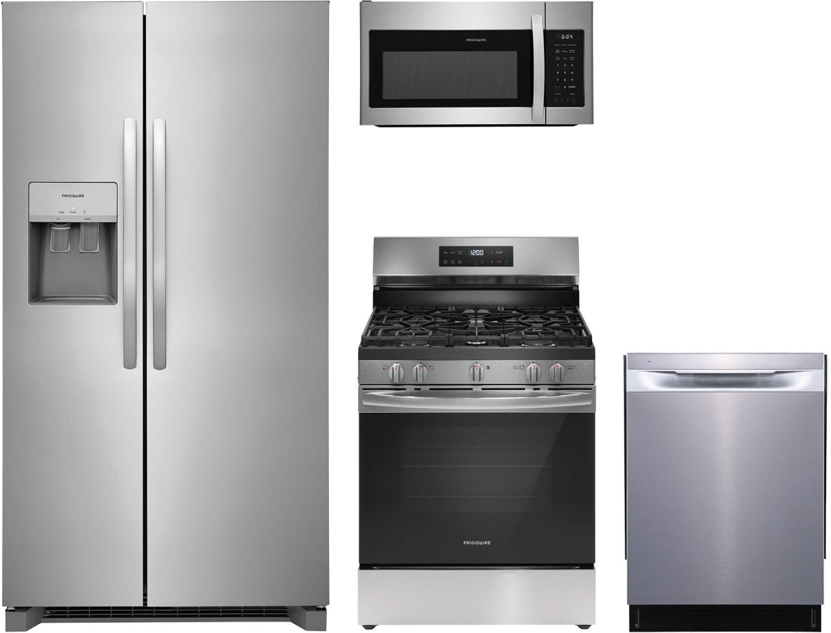 Frigidaire® 4 Piece Stainless Steel Kitchen Package with side-by-side refrigerator, top control built in dishwasher, freestanding induction range, and over the range microwave.Read More