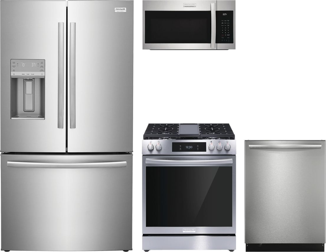 Frigidaire Gallery® 4 Piece Smudge-Proof® Stainless Steel Kitchen Package with French door refrigerator, slide in gas range, built in dishwasher and over the range microwave.Read More